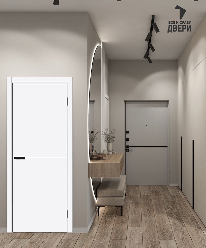 Межкомнатная глухая дверь Браво-0.21 щитовой конструкции с контрастными вставками и кромкой с 4 сторон, исполнение «П» (Премиум). Вставка: Black Silk — чёрные матовые декоративные вставки и кромка.